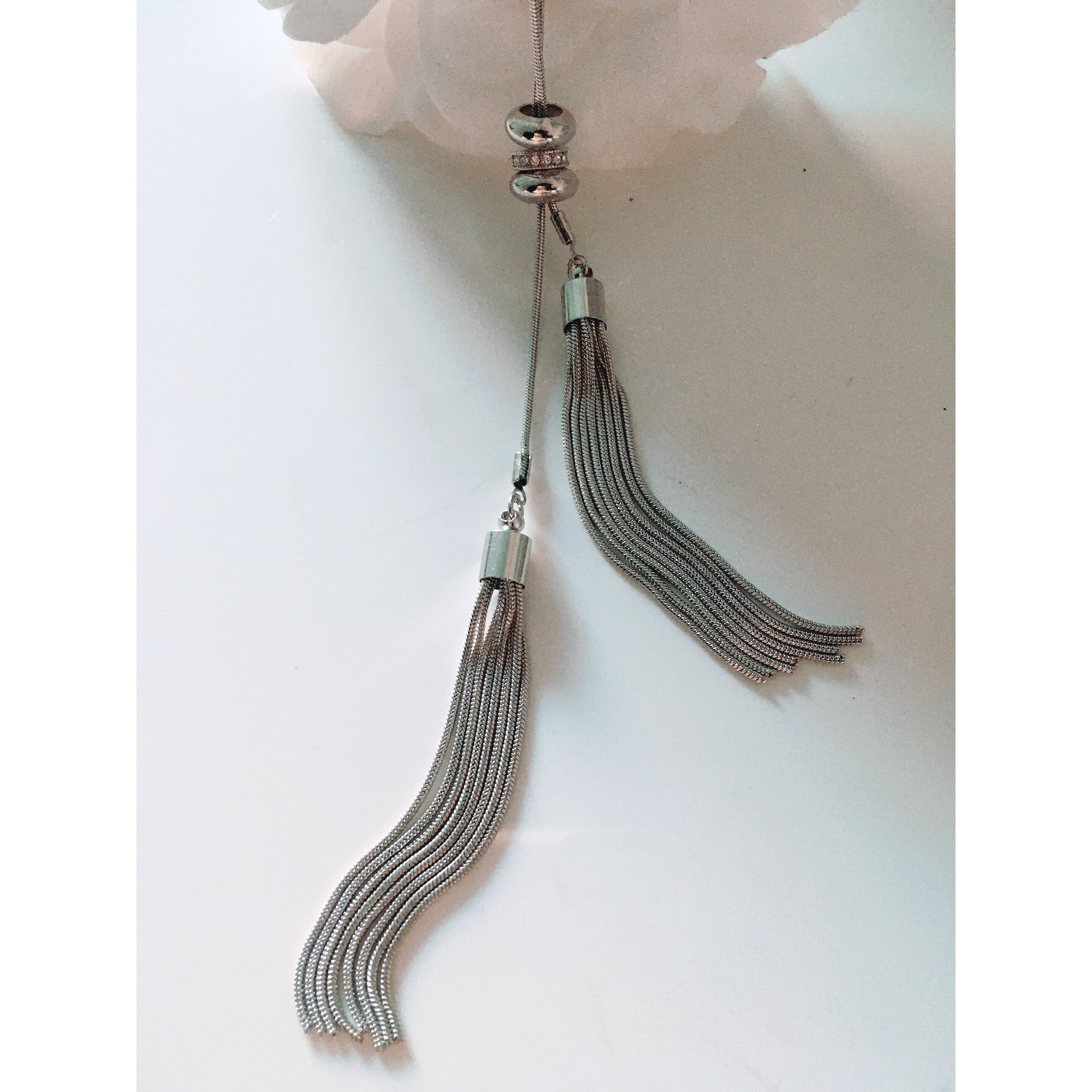 留め具の場所を調整できるので、ラリエットのようにタッセルの高さを変えて着用することが可能です。