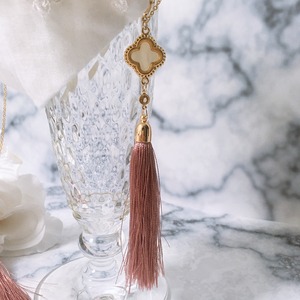 イヤリング代わりになる上品な長めのタッセルがおしゃれ。パーツの一部にスワロフスキー®クリスタルを使用したゴールドベースのマスクチェーンです。