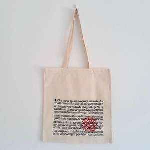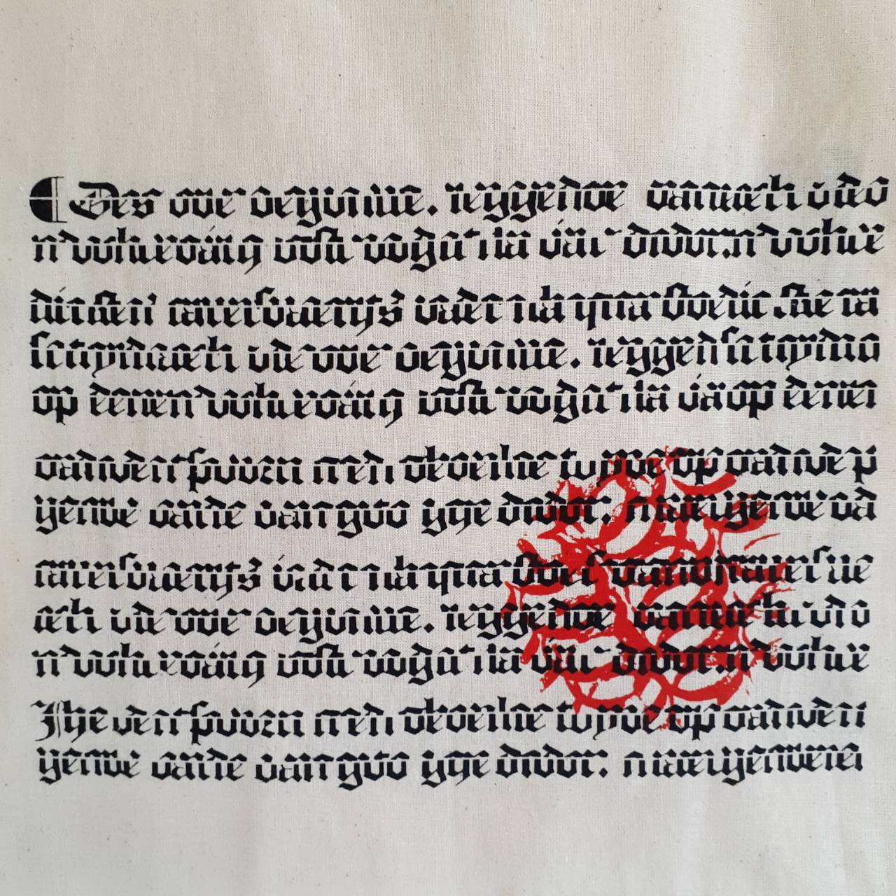 ゴシック体のデザインは両面プリントです。書かれている言葉は低地ドイツ語・中世オランダ語で、特別な意味のあるメッセージではないため、安心してお持ちいただけます。